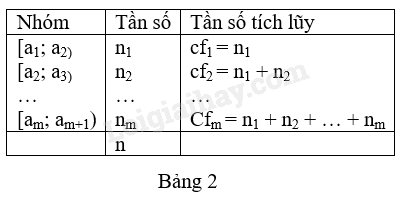 Bảng tần số ghép nhóm bao gồm cả tần số tích lũy được lập như ở Bảng 2.