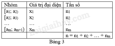 Cho mẫu số liệu ghép nhóm như ở bảng 3, trong đó giá trị đại diện của nhóm là trung điểm xi của nửa khoảng (tính bằng trung bình cộng của hai đầu mút) ứng với nhóm i.