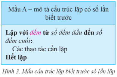 – Khi biết số lần lặp, thể hiện cấu trúc lặp có dùng biến để đếm số lần lặp.