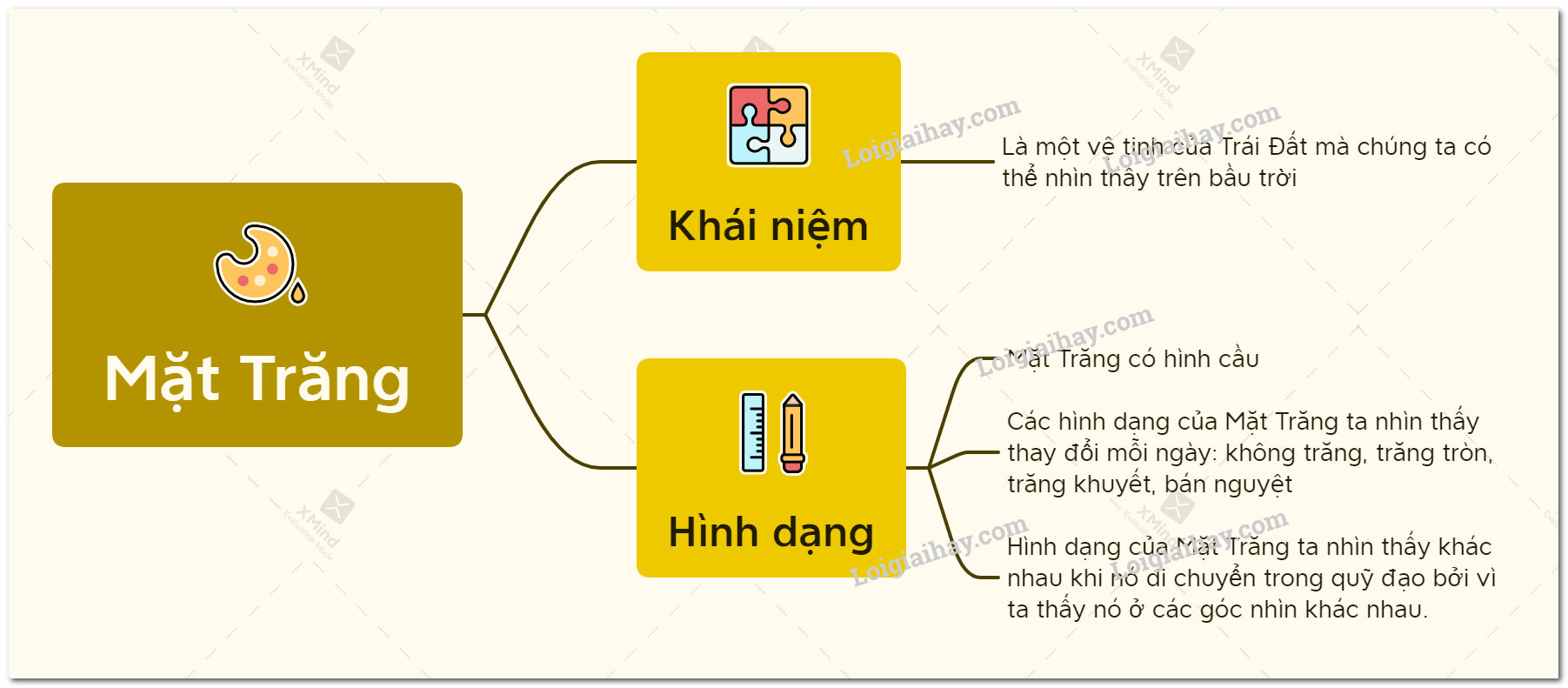 – Các hình dạng nhìn thấy của Mặt Trăng là: Trăng tròn, Trăng khuyết, Trăng bán nguyệt, Trăng lưỡi liềm, không Trăng.