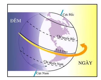 – Do sự chuyển động tự quay quanh trục theo hướng từ tây sang đông nên ở khắp mọi nơi trên Trái Đất đều lần lượt có ngày và đêm luân phiên nhau.
