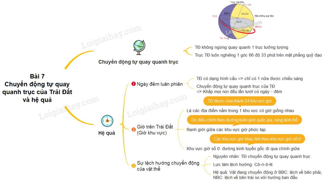 Sơ đồ tư duy chuyển động tự quay quanh trục của Trái Đất và hệ quả