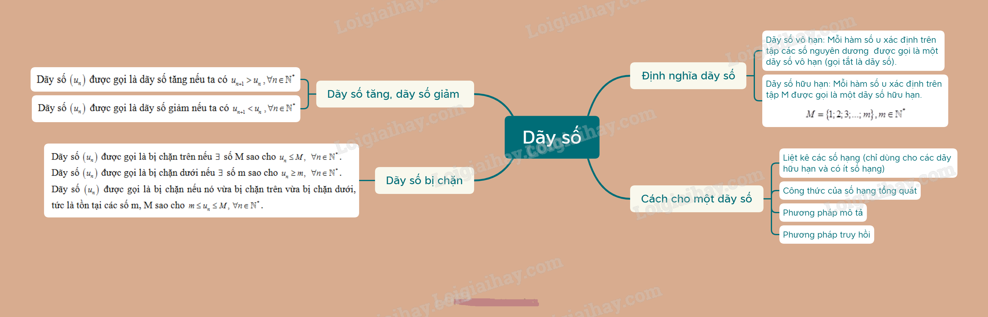 • Dãy số \(\left( {{u_n}} \right)\) được gọi là bị chặn nếu nó vừa bị chặn trên vừa bị chặn dưới, tức là tồn tại các số m, M sao cho \(m \le {u_n} \le M,\)\(\forall n \in {\mathbb{N}^*}\).