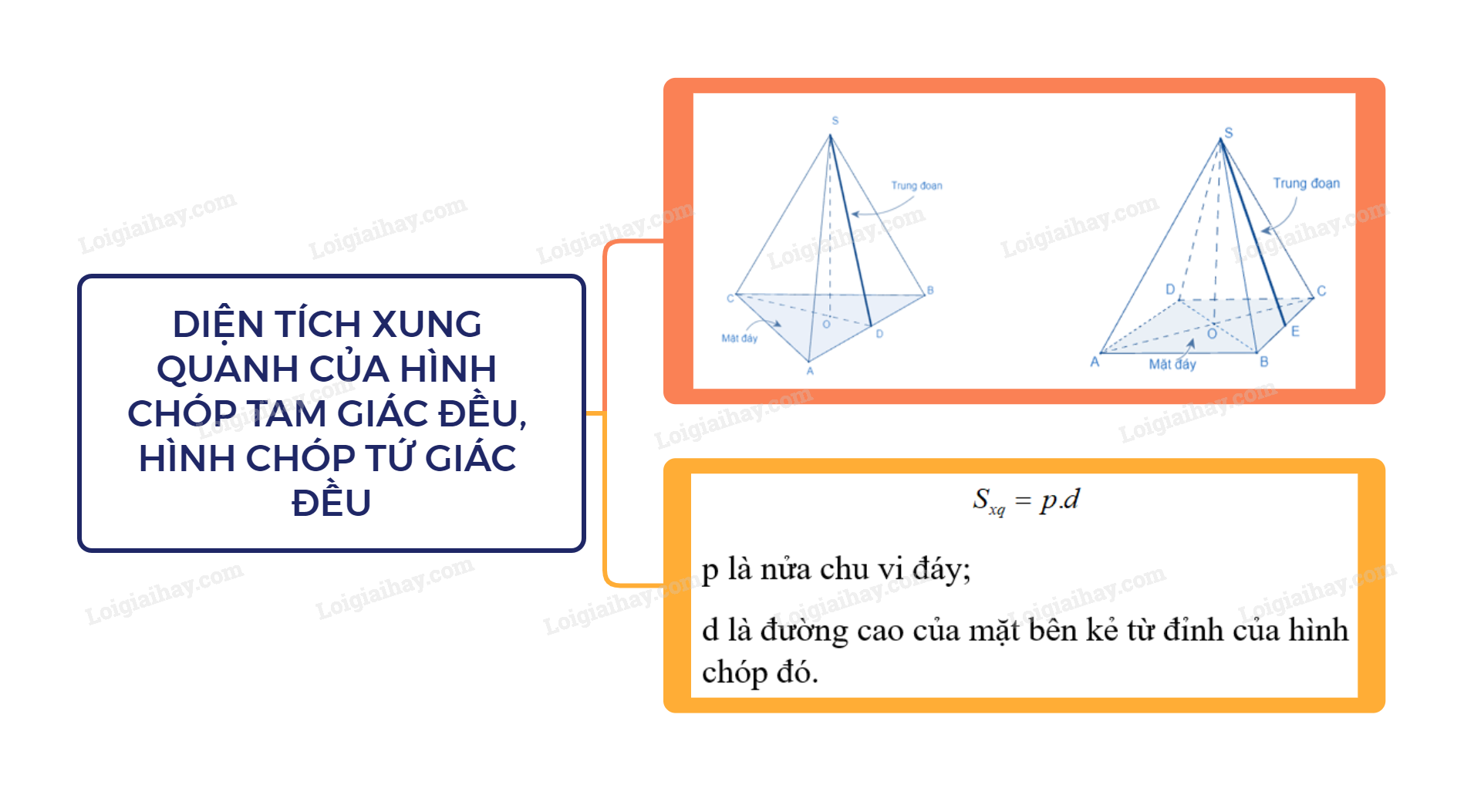 Diện tích xung quanh, kí hiệu là \({S_{xq}}\) của hình chóp tam giác đều hoặc hình chóp tứ giác đều được tính theo công thức: