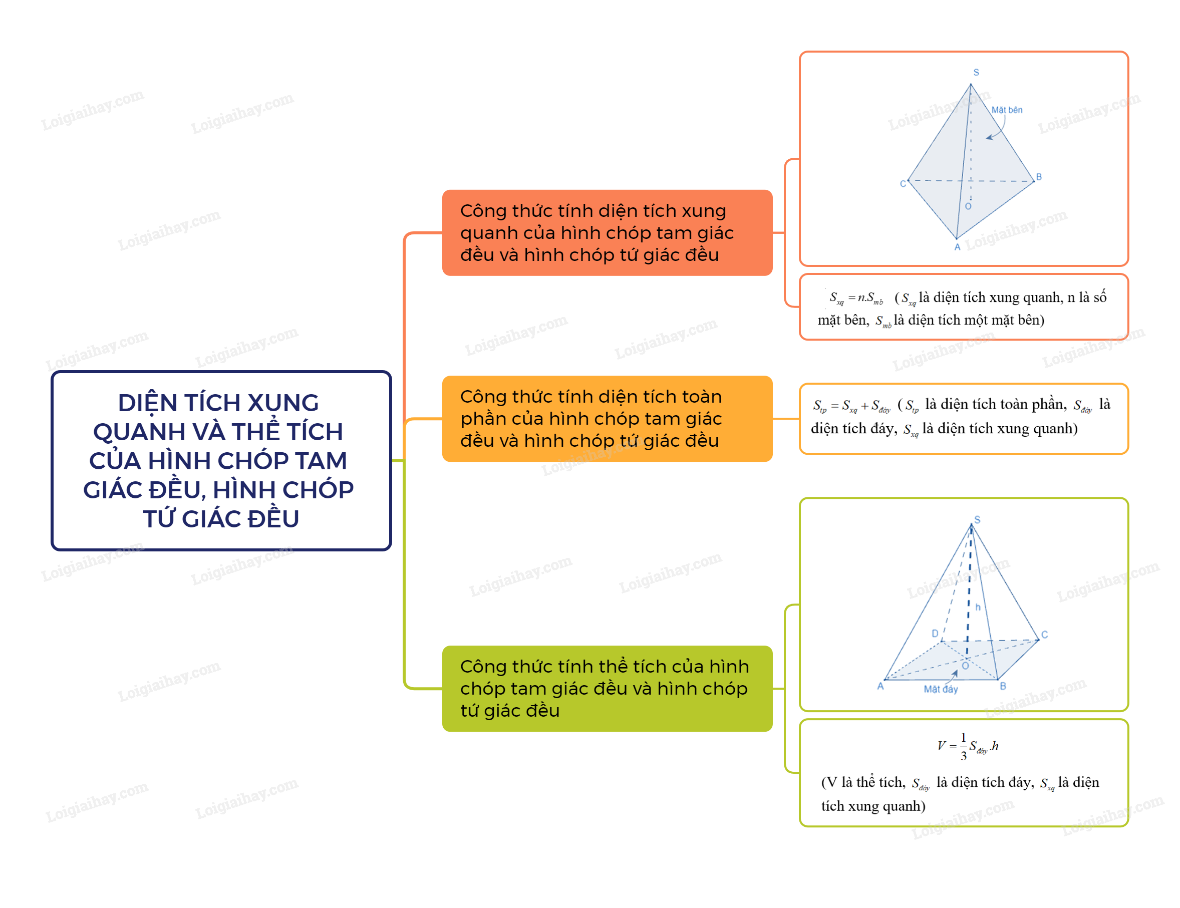Diện tích toàn phần của hình chóp tam giác đều (hình chóp tứ giác đều) bằng tổng của diện tích xung quanh và diện tích đáy:  (\({S_{tp}} = {S_{xq}} + {S_{đáy}}\) (\({S_{tp}}\) là diện tích toàn phần,  là diện tích đáy, \({S_{xq}}\) là diện tích xung quanh)