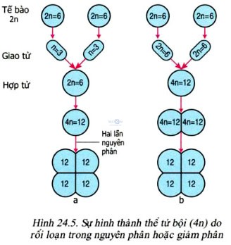 + Hợp tử nguyên phân → các cặp NST nhân đôi ở kì trung gian → hợp tử 4n → tất cả các cặp NST không phân li trong quá trình nguyên phân → giao tử 4n # giao tử bình thường (2n).
