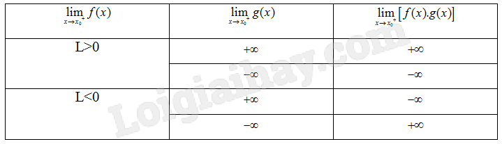 Nếu \(\mathop {\lim }\limits_{x \to {x_0}^ + } f(x) = L \ne 0\) và \(\mathop {\lim }\limits_{x \to {x_0}^ + } g(x) =  + \infty \)hoặc \(\mathop {\lim }\limits_{x \to {x_0}^ + } g(x) =  – \infty \)thì \(\mathop {\lim }\limits_{x \to {x_0}^ + } \left[ {f(x).g(x)} \right]\) được tính như sau: