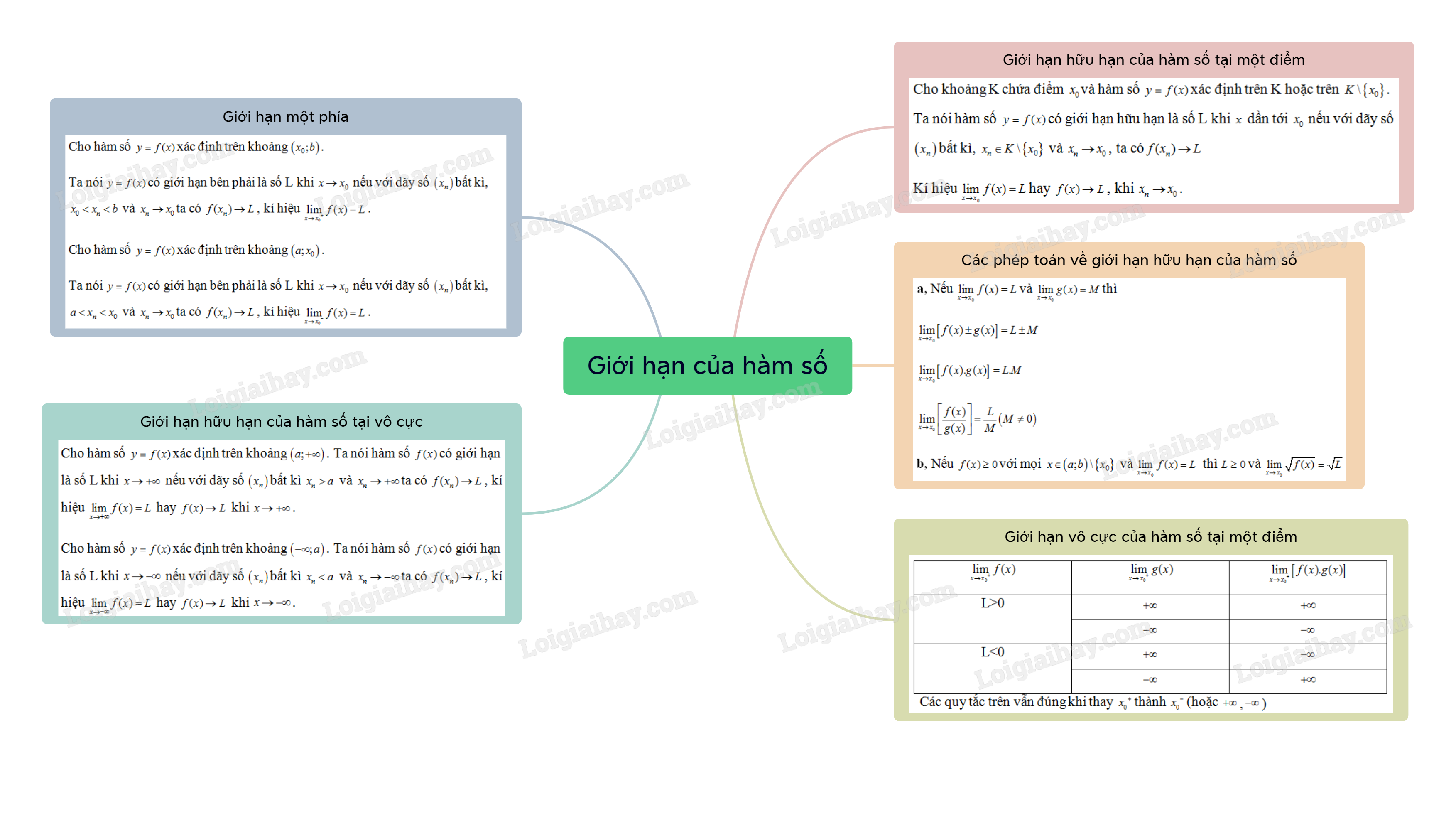 • \(\mathop {\lim }\limits_{x \to {x_0}^ – } f(x) \ne \mathop {\lim }\limits_{x \to {x_0}^ + } f(x)\) thì không tồn tại \(\mathop {\lim }\limits_{x \to {x_0}} f(x)\).