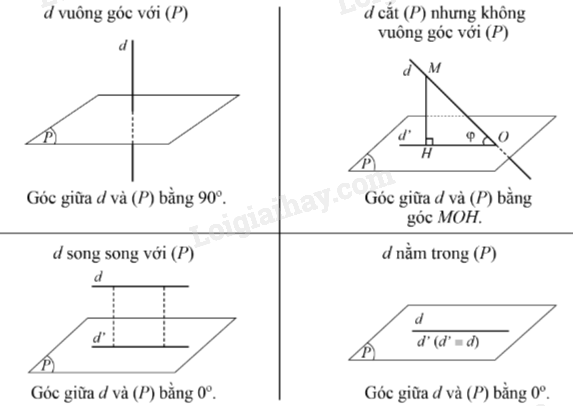 – Nếu đường thẳng d không vuông góc với mặt phẳng (P) thì góc giữa đường thẳng d và mặt phẳng (P) là góc giữa d và hình chiếu d’ của đường thẳng d trên (P).