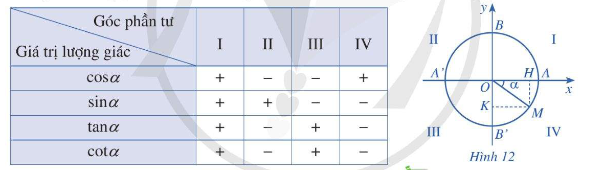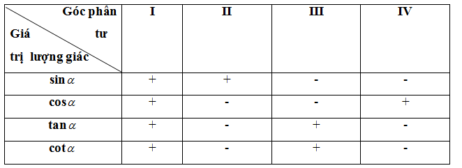* Dấu của các giá trị lượng giác của góc \(\alpha \)