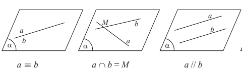 • Nếu a và b cùng nằm trong một mặt phẳng thì ta nói a và b đồng phẳng. Khi đó, a và b có thể cắt nhau, song song với nhau hoặc trùng nhau.