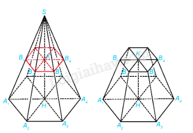 Hình gồm các đa giác đều\({A_1}{A_2} \ldots {A_n}.{B_1}{B_2} \ldots {B_n}\) và các hình thang cân \({A_1}{A_2}{B_2}{B_1},{A_2}{A_3}{B_3}{B_2}, \ldots ,{A_n}{A_1}{B_1}{B_n}\) được gọi là một hình chóp cụt đều (nói đơn giản là hình chóp cụt được tạo thành từ hình chóp đều \(S.{A_1}{A_2} \ldots {A_n}\) sau khi cắt đi chóp đều \(S \cdot {B_1}{B_2} \ldots {B_n}\)), kí hiệu là \({A_1}{A_2} \ldots {A_n} \cdot {B_1}{B_2} \ldots {B_n}\).