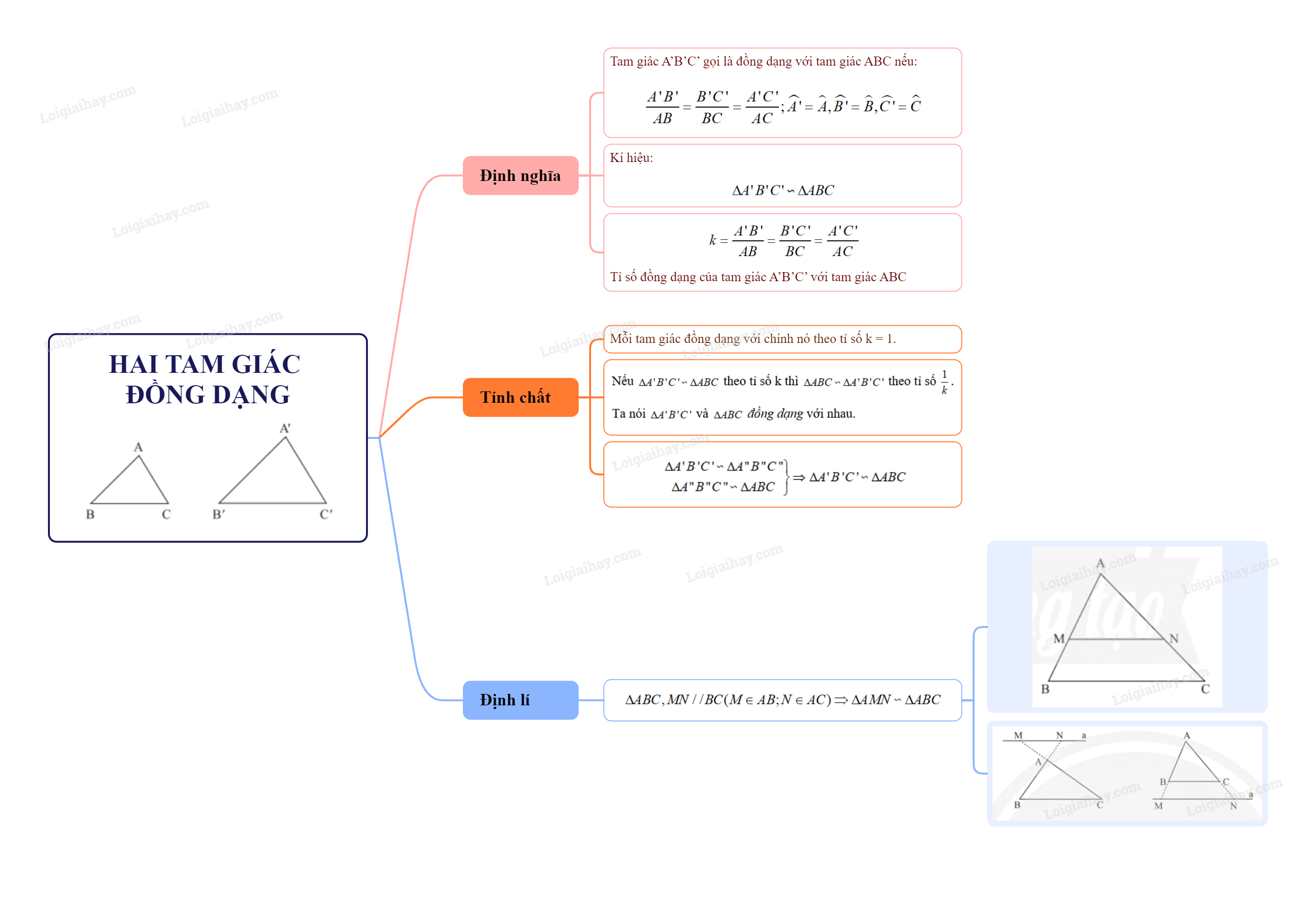 \(\widehat {A’} = \widehat A,\widehat {B’} = \widehat B,\widehat {C’} = \widehat C\) và \(\frac{{A’B’}}{{AB}} = \frac{{B’C’}}{{BC}} = \frac{{A’C’}}{{AC}}\)