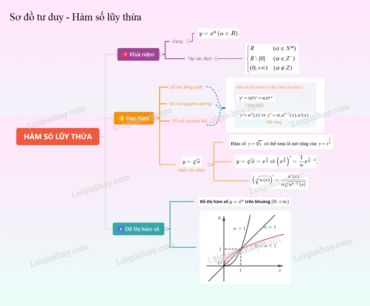 – Hàm số \(y = {x^\alpha }\) có đạo hàm tai mọi \(x ∈ (0; +∞)\) và \(y’ = \left( {{x^\alpha }} \right)’ = \alpha {x^{\alpha  – 1}}\)