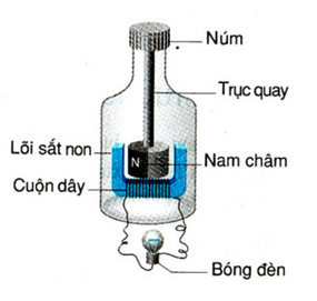 Hoạt động: Khi quay núm của đinamô thì nam châm quay theo, xuất hiện dòng điện trong cuộn dây làm đèn sáng.