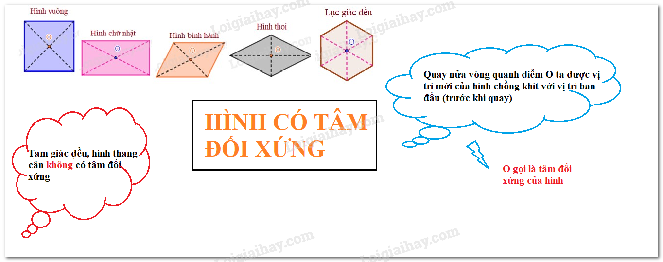 +) Những hình có một điểm O sao cho khi quay nửa vòng quanh điểm O ta được vị trí mới của hình chồng khít với vị trí ban đầu (trước khi quay) thì được gọi là hình có tâm đối xứng và điểm O được gọi là tâm đối xứng của hình.