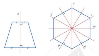 Hình lục giác đều có 6 trục đối xứng là các đường thẳng m, n, p, q, r, s.