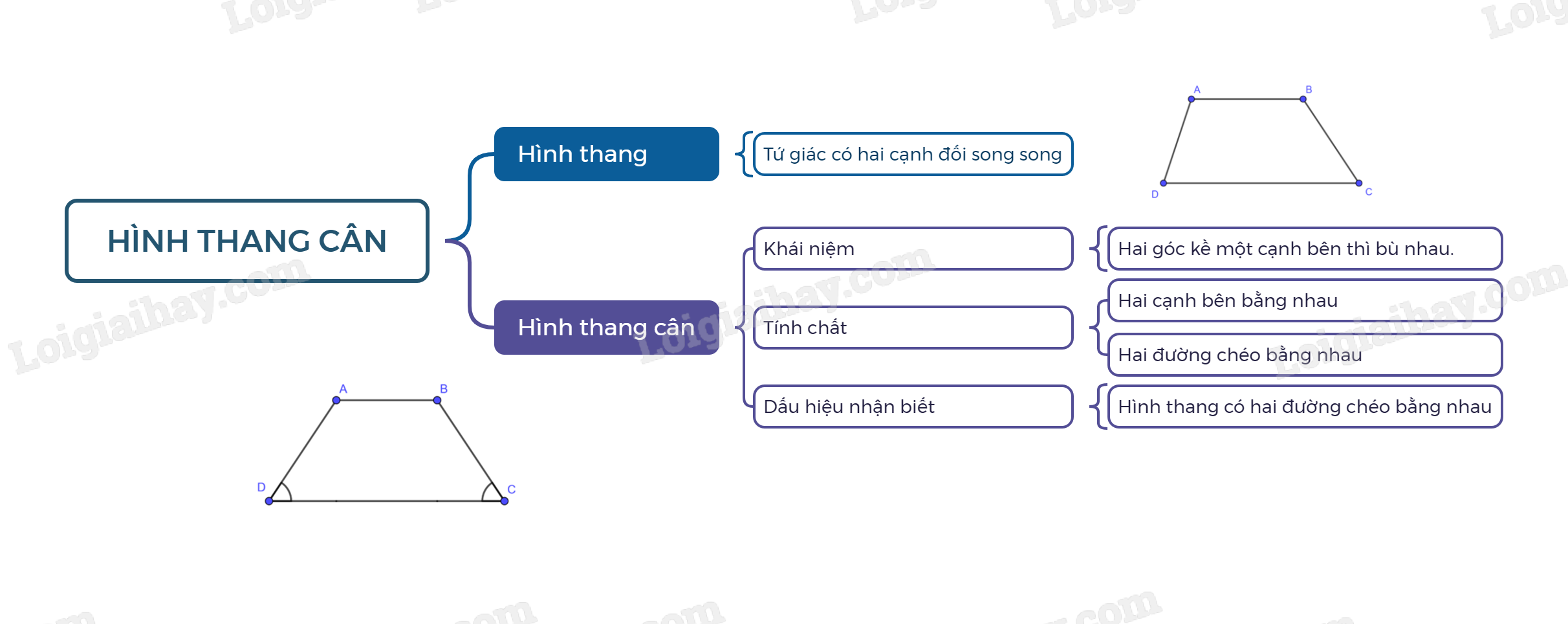 Hình thang cân là hình thang có hai góc kề một đáy bằng nhau.