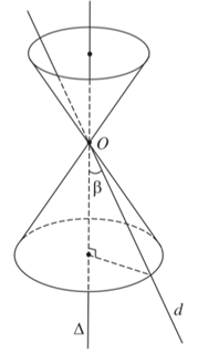 Đường thẳng \(\Delta \) là trục, đường thẳng \(d\) goi là đường sinh và góc \(2\beta \) goi là góc ở đỉnh của mặt nón đó.