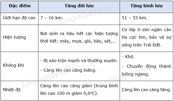 Bảng đặc điểm của tầng đối lưu và tầng bình lưu