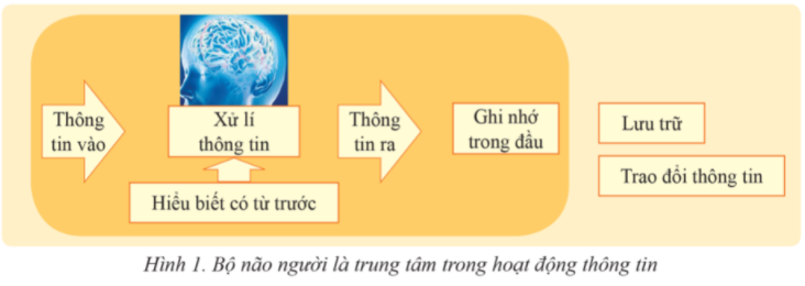 Hình 1 minh hoạ tóm tắt các bước của quá trình hoạt động thông tin: Con người thu nhận thông tin từ thế giới bên ngoài, xử lí thông tin, ghi nhớ hoặc lưu trữ thông tin, trao đổi thông tin. Não người là trung tâm trong quá trình này.