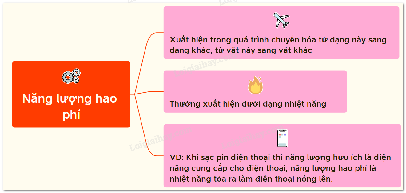 Ví dụ: Khi sạc pin điện thoại thì năng lượng hữu ích là điện năng cung cấp cho điện thoại; năng lượng hao phí là nhiệt năng tỏa ra làm điện thoại nóng lên.