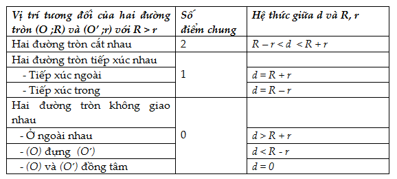 Cho hai đường tròn \(\left( {O;R} \right)\) và \(\left( {O’;r} \right)\)\(,R > r\) . Đặt \(OO’ = d.\) Ta có: