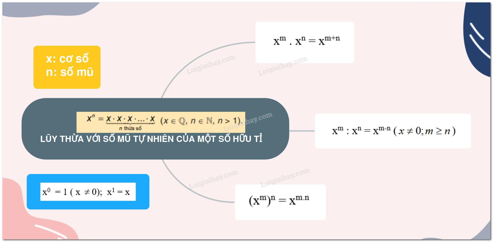 + Khi nhân 2 lũy thừa cùng cơ số, ta giữ nguyên cơ số và cộng 2 số mũ