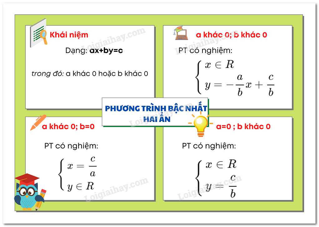 +) Nếu $a \ne 0$$b \ne 0$ thì phương trình có nghiệm  $\left\{ \begin{array}{l}x \in R\\y =  – \dfrac{a}{b}x + \dfrac{c}{b}\end{array} \right.$