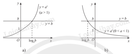 – Nếu b > 0 thì phương trình có nghiệm duy nhất \(x = {\log _a}b\).