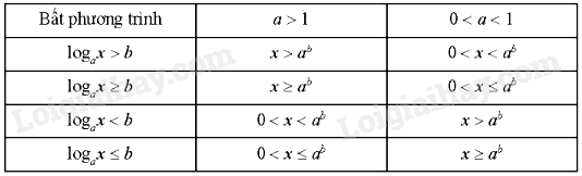 Nếu 0 < a < 1 thì \({\log _a}u\left( x \right) > {\log _a}v\left( x \right) \Leftrightarrow \left\{ \begin{array}{l}u\left( x \right) > 0\\u\left( x \right) < v\left( x \right)\end{array} \right.\).