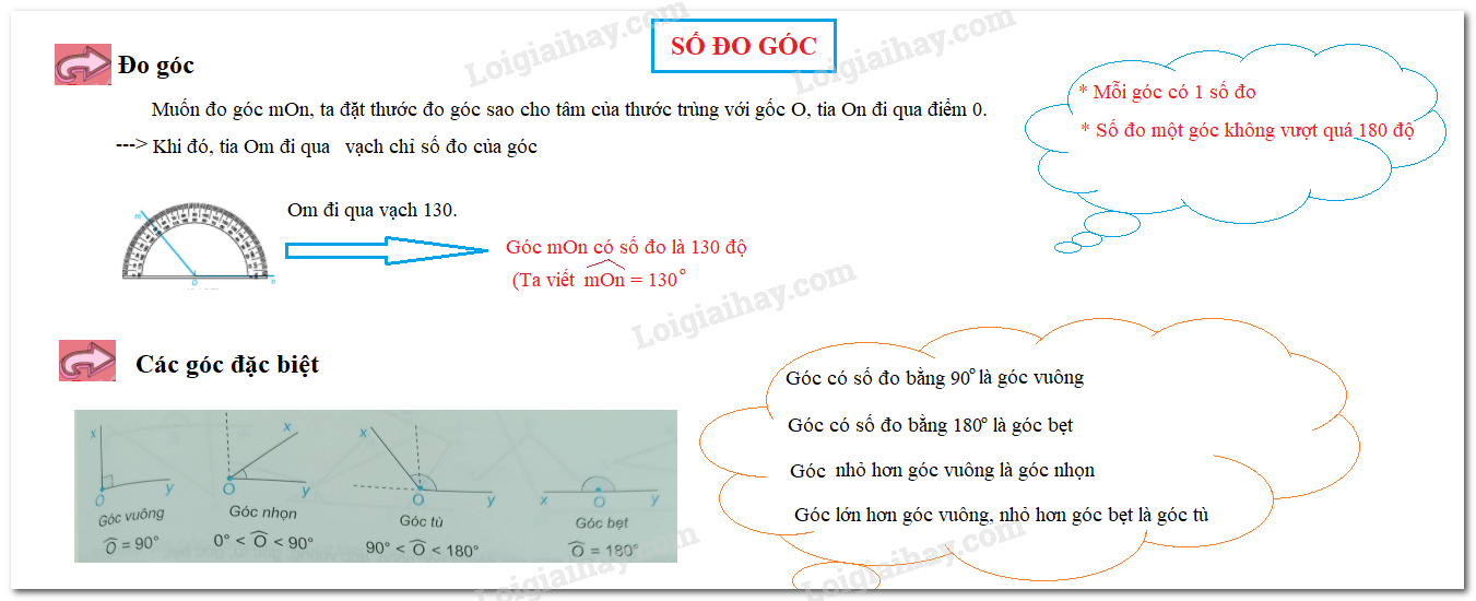 – Bước 3: Xác định xem cạnh còn lại của góc (cạnh Ox) đi qua vạch chỉ số nào trên thước đo góc, ta sẽ được số đo của góc đó.