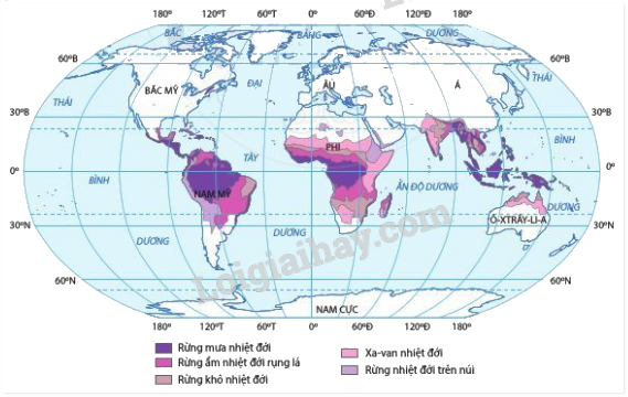 Hình 23.3. Lược đồ sự phân bố các kiểu rừng nhiệt đới trên Trái Đất
