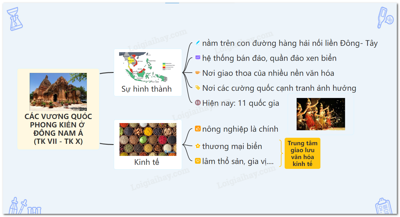 – Trên nền tảng các vương quốc cổ, kinh tế của các vương quốc phong kiến ở Đông Nam Á tiếp tục phát triển. Các vương quốc ở lục địa có ưu thế phát triển kinh tế nông nghiệp, các vương quốc ở hải đảo có thế mạnh thương nghiệp, hàng hải, cung cấp nhiều sản vật như hương liệu,gia vị,… cho thương nhân nước ngoài.