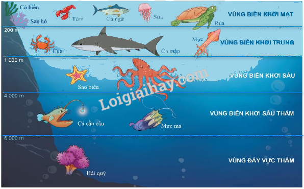 – Ở các vĩ độ và độ cao sâu khác nhau (có sự khác nhau về độ muối, áp suất, ánh sáng, nồng độ oxy,…) nên sẽ có các loài sinh vật khác nhau.