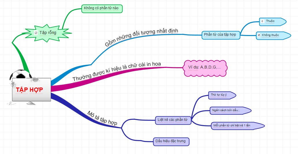Cách viết tập hợp: Các phần tử của tập hợp được viết trong 2 dấu ngoặc nhọn, cách nhau bởi dấu phảy. Mỗi phần tử được liệt kê 1 lần, thứ tự tùy ý
