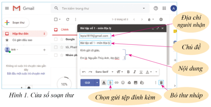– Bước 2: Soạn và gửi thư. Chọn mục Soạn thư, tại cửa sổ Thư mới: nhập địa chỉ email của người nhận thư, nhập chủ đề thư, soạn nội dung thư và chọn Gửi.