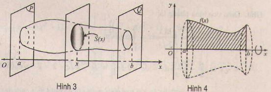 a) Hình phẳng quay quanh trục \(Ox\): Cho hình phẳng được giới hạn bởi đồ thị hàm số \(y = f(x)\) không âm và liên tục trên đoạn \([a;b]\), trục \(Ox\) và hai đường thẳng \(x = a, x = b\) quay quanh trục \(Ox\), ta được khối tròn xoay (h.4). Thể tích  \({V_x}\) của khối tròn xoay này được cho bởi công thức: $${V_x} = \pi {\int_a^b {\left[ {f(x)} \right]} ^2}dx.$$