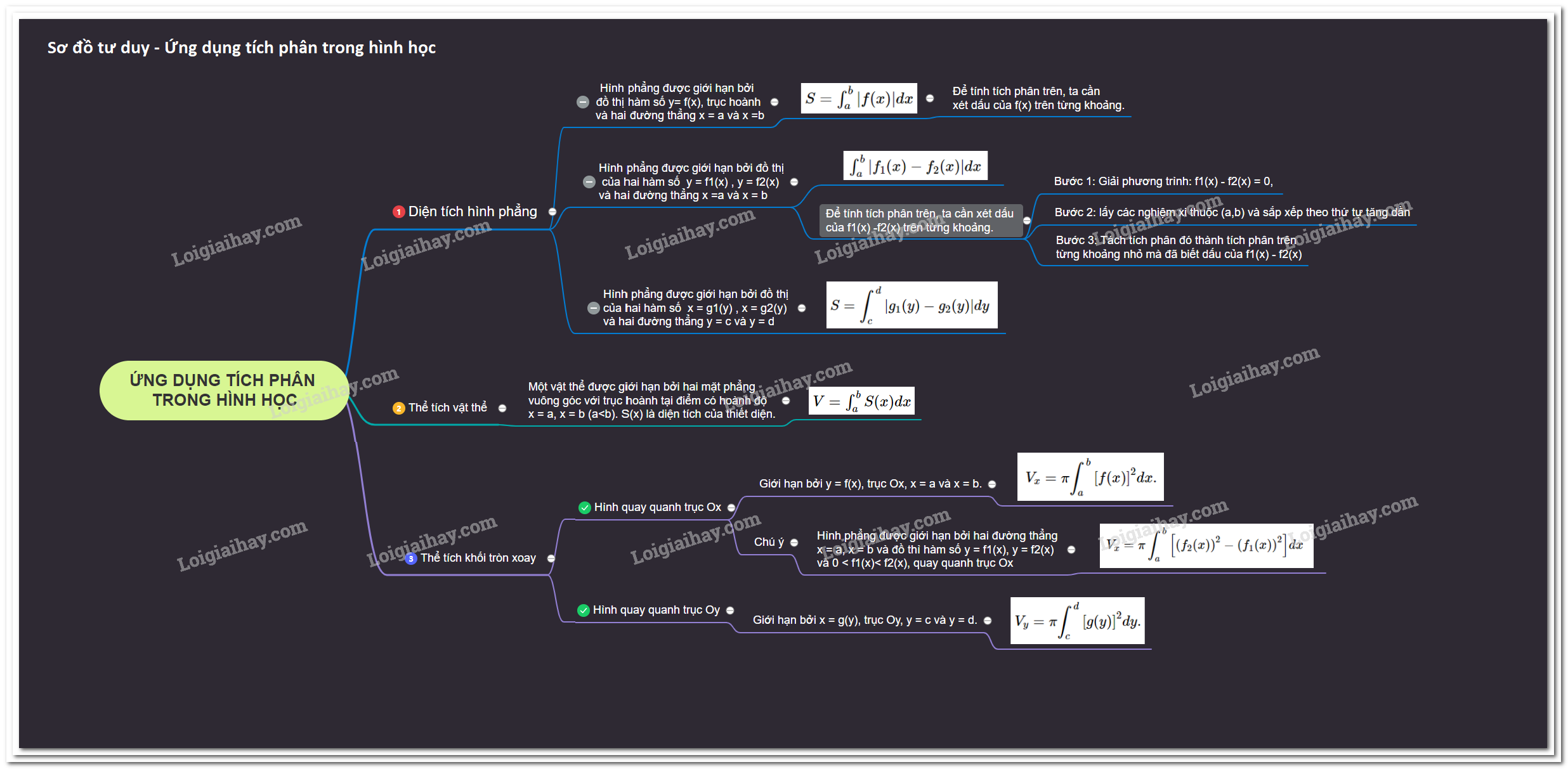 Chú ý: Để tính tích phân trên, ta xét dấu \(f\left( x \right) = \;{f_1}\left( x \right){\rm{ }}\; – {\rm{ }}{f_2}\left( x \right)\) trên đoạn \([a;b]\) hoặc tìm nghiệm của nó trên khoảng \((a;b)\), sau đó áp dụng tính chất nêu ở chú ý trên. Cụ thể ta thực hiện các bước sau: