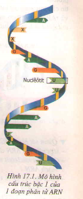 ARN được cấu tạo theo nguyên tắc đa phân. Đơn phân là nuclêôtit gồm 4 loại là A (ađêmin), G (guanin), X (xitozin) và U (uraxin). Nhìn chung phân tử ARN khi mới được tổng hợp ở trong nhân tế bào cómô hình cấu trúc như hình 17.1