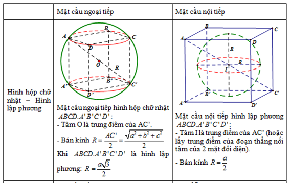 – Hình hộp chữ nhật có mặt cầu ngoại tiếp, hình lập phương có cả mặt cầu ngoại tiếp và mặt cầu nội tiếp.