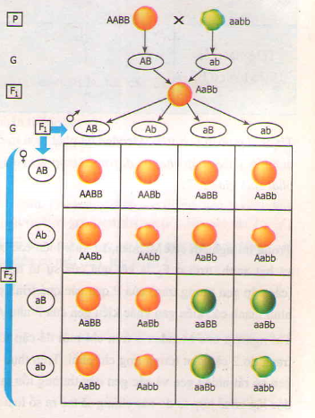 Sự kết hợp của 2 loại giao tử này trong thụ tinh tạo ra cơ thể lai F1 có kiểu gen là AaBb. Khi cơ thể lai F1 hình thành giao tử, do sự phân li độc lập và tổ hợp tự do của các cặp gen tương ứng (khả năng tổ hợp tự do của các cặp gen tương ứng (khả năng tổ hợp tự do giữa A và a với B và b là như nhau) đã tạo ra 4 loại giao tử với tỉ lệ ngang nhau là AB, Ab, aB và ab.