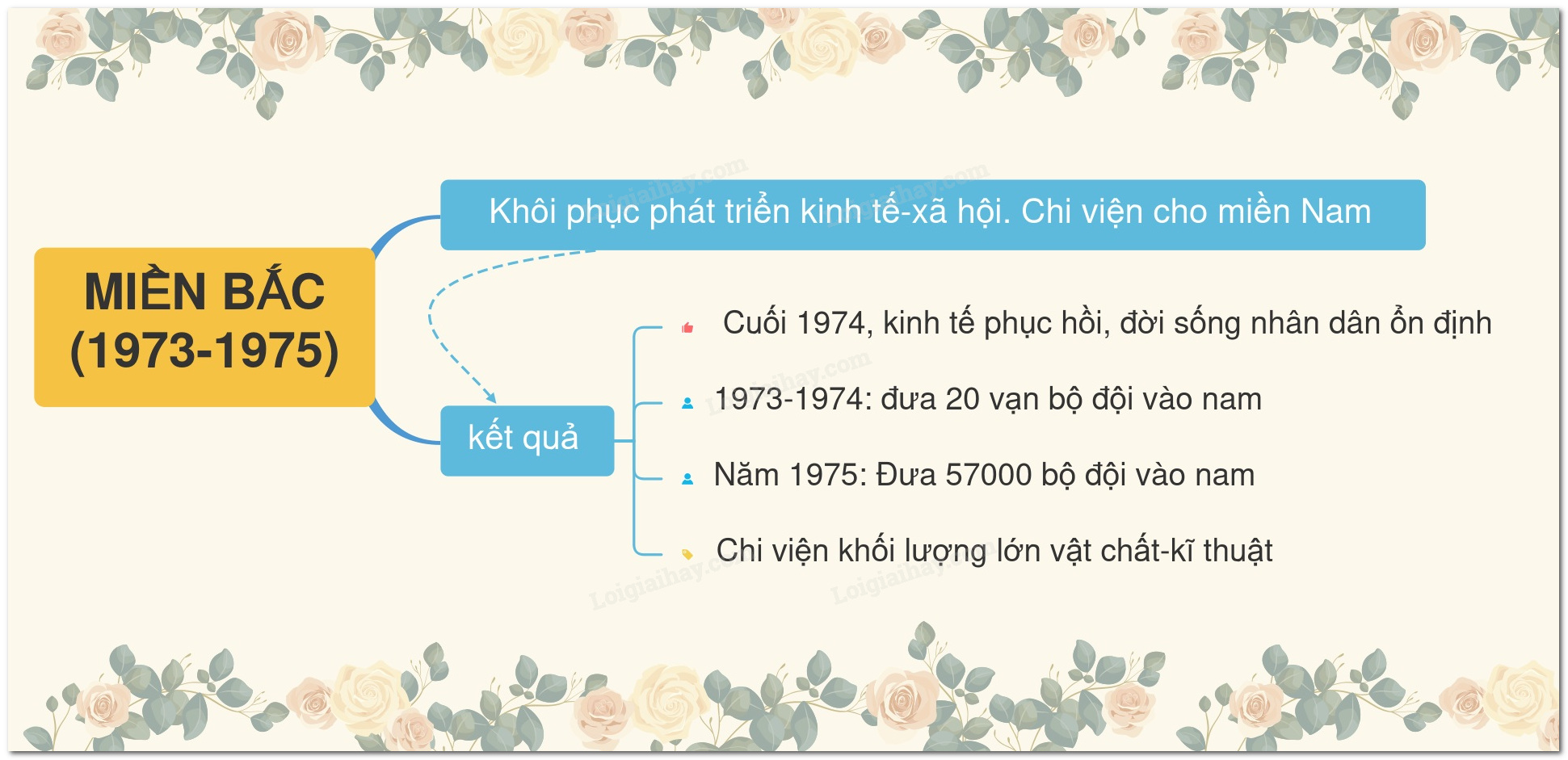 – Sau Hiệp định Pari 1973, miền Bắc trở lại hòa bình, vừa tiến hành khắc phục hậu quả chiến tranh, khôi phục và phát triển kinh tế – xã hội, vừa tiếp tục chi viện cho tiền tuyến miền Nam.