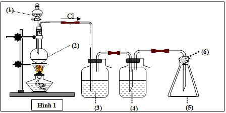 Câu 9: Mô hình điều chế khí clo trong phòng thí nghiệm được cho như hình vẽ bên (Hình 1). Quy trình thí nghiệm xảy ra như sau: Nhỏ từ từ dung dịch (1) xuống bình cầu có chứa chất rắn màu đen (2). Đun nóng hỗn hợp thì thoát ra khí clo (màu vàng lục). Khí clo sinh ra di chuyển theo hệ thống bình (3); (4); (5). Tại bình số (5), khí clo được giữ lại. Để tránh việc clo thoát ra ngoài không khí, người ta tẩm vào (6) dung dịch T. Vậy (6) là: