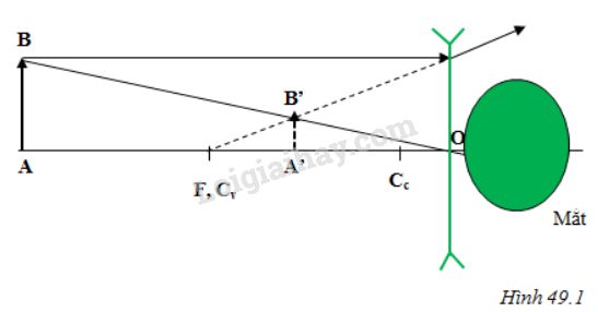 + Khi đeo kính, muốn nhìn rõ ảnh A’B’ của AB thì A’B’ phải hiện lên trong khoảng từ điểm cực cận Cc đến điểm cực viễn Cv của mắt. Yêu cầu này có thực hiện được với kính cận nói trên (xem hình 49.1)