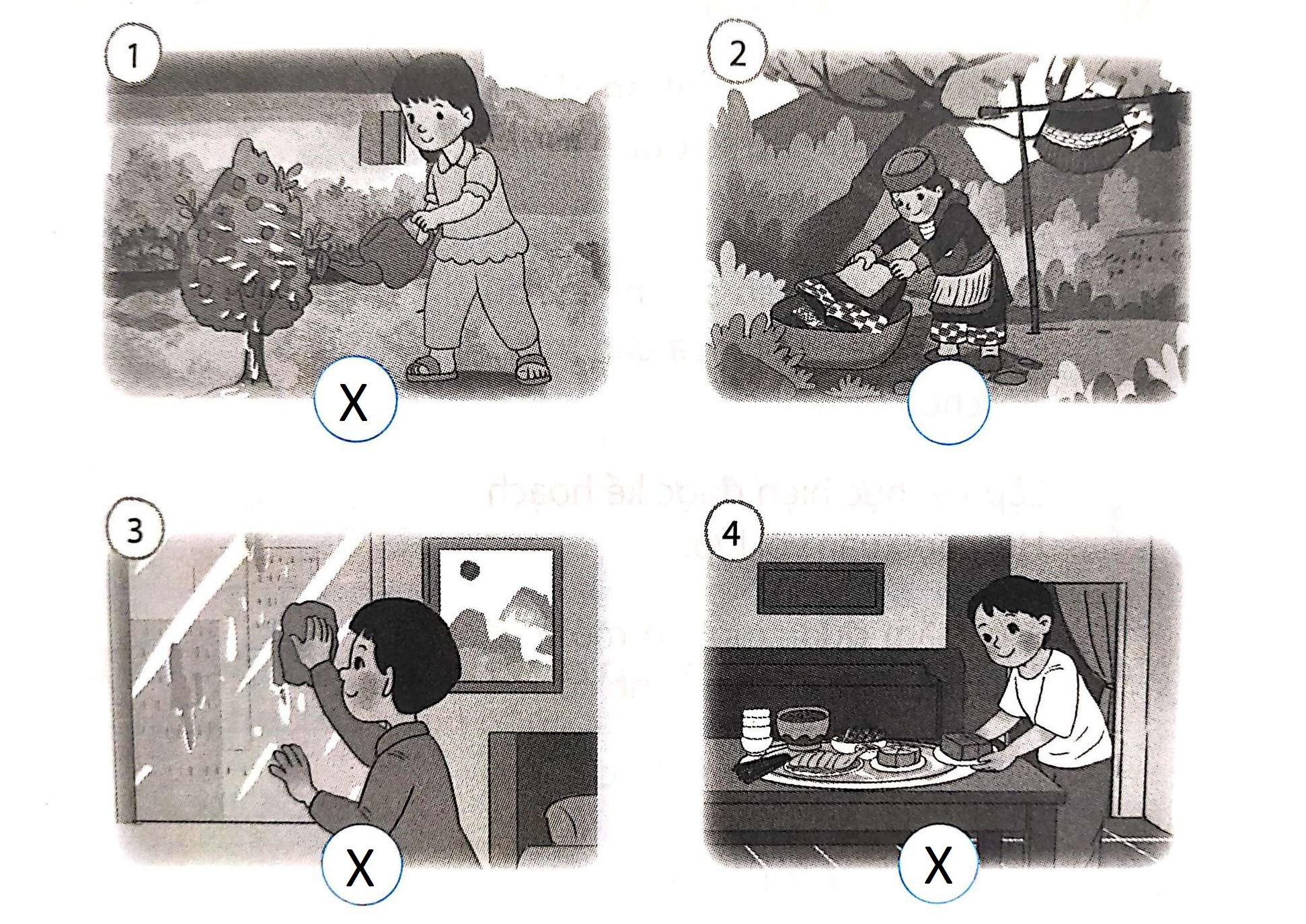 Đánh dấu X vào ô tròn dưới những công việc mà em có thể tự thực hiện trong những tranh sau.