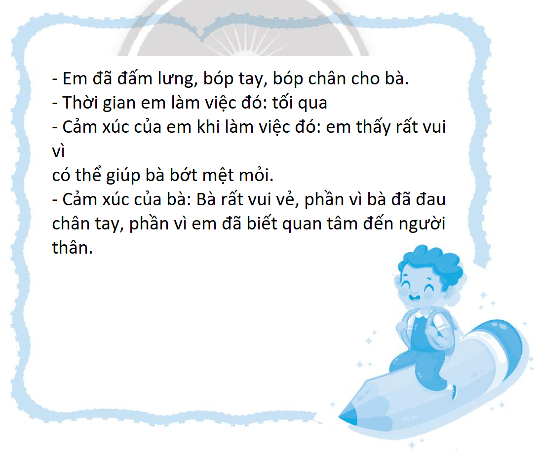 – Dựa vào những câu hỏi gợi ý, và trả lời các câu hỏi như: Em đã làm gì để thể hiện sự quan tâm chăm sóc, lòng biết ơn với người thân? Em làm việc đó khi nào? Cảm xúc của em khi làm việc đó ra sao? Cảm xúc của người thân khi thấy em làm việc đó như thế nào?