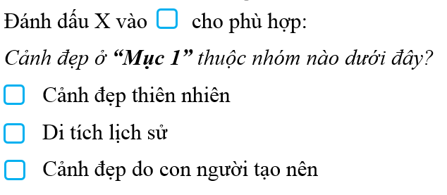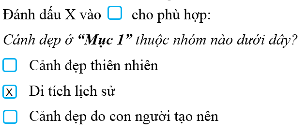 – Đầu tiên em cần hiểu rõ các đáp án mà đề bài cho. Cảnh đẹp thiên nhiên là cảnh đẹp như thế nào? Di tích lịch sử là gì? Cụ thể: Cảnh đẹp thiên nhiên là cảnh đẹp có sẵn ngoài tự nhiên, không có sự tác động của con người; di tích lịch sử là địa điểm, công trình có giá trị lịch sử, văn hóa, khoa học.