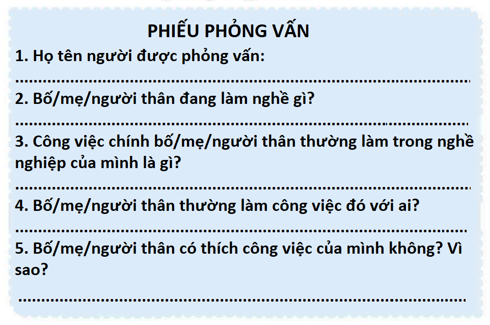 1. Chọn một người (bố, mẹ, người thân) mà em muốn phỏng vấn. 2. Phỏng vấn ngắn bố, mẹ hoặc người thân về công việc chính trong nghề nghiệp theo gợi