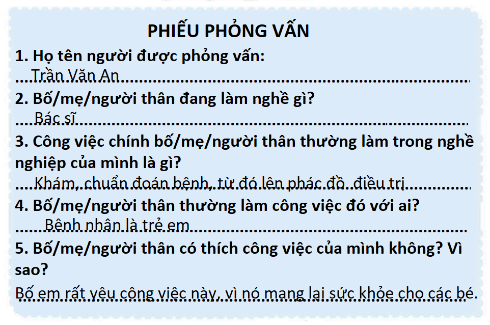 Phỏng vấn ngắn bố, mẹ hoặc người thân về công việc chính trong nghề nghiệp theo gợi ý:
